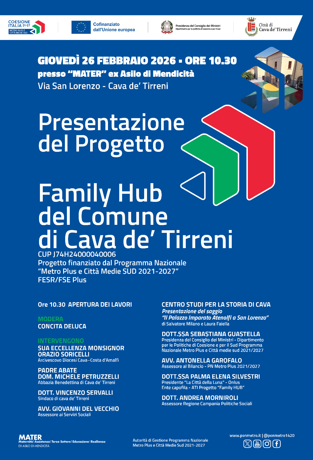 In coerenza con l’Obiettivo specifico FSE ESO 4.11, il Comune di Cava de’ Tirreni ha attivato un Family HUB presso il Complesso edilizio San Lorenzo – “ex Asilo di mendicità”, spazio comunale ristrutturato e dedicato al sostegno di minori, famiglie e persone a rischio di povertà o marginalità sociale.